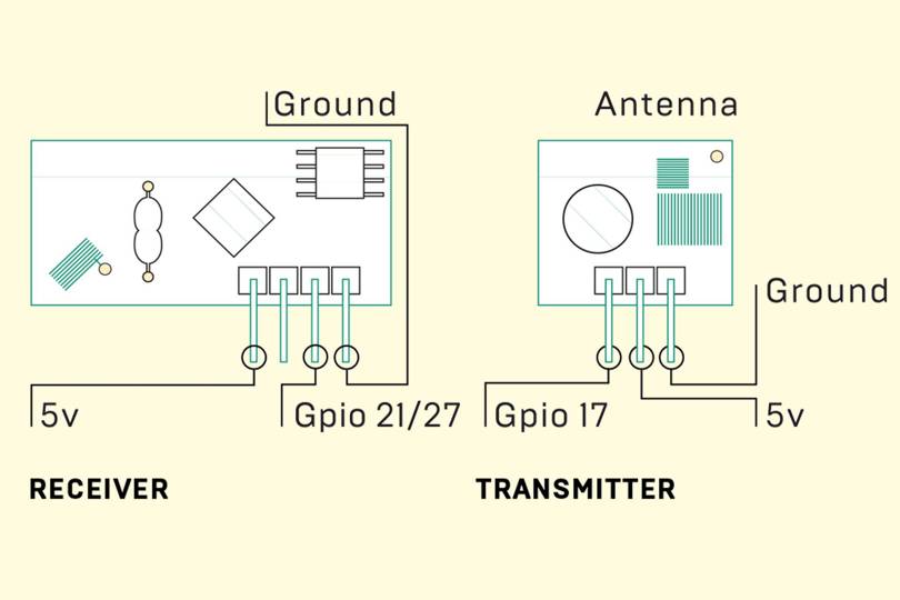 - Connect wires to Rf transmitter and receiver chips(wiring diagram). See this article for more info on gpio pins. If you would like to use different pins check out Ninjablocks 433Utils GPIO Pin Layout